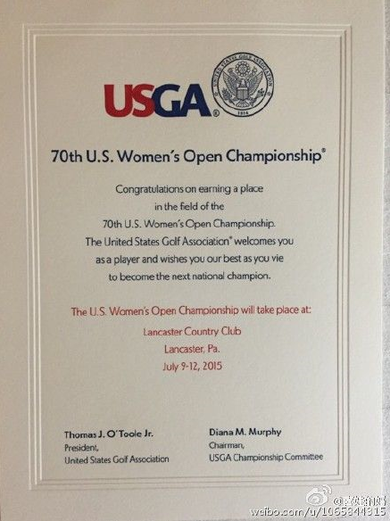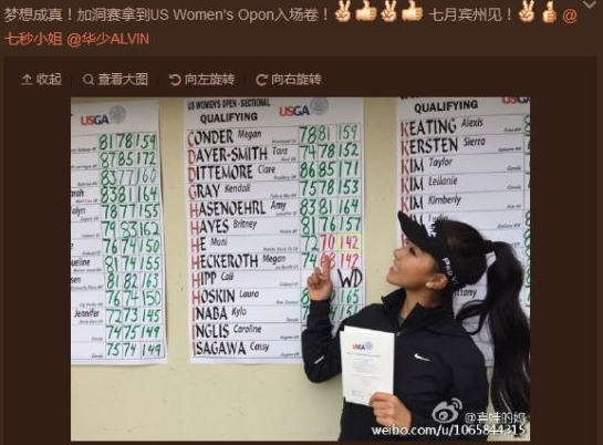 此次资格赛后第一时间,何沐妮在微博上晒出了USGA的参赛权证明,以及自己与计分板的合影,欢呼“梦想成真”。今年7月9日至12日,她与作为高尔夫大满贯舞台上最新的华人面孔,出现在宾夕法尼亚州兰卡斯特乡村俱乐部(LancasterCountry Club)的赛场之上。