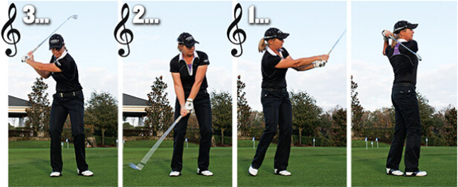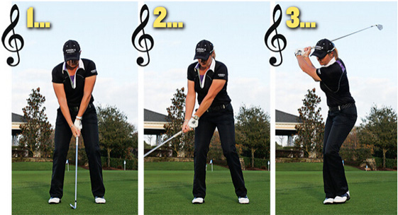 当你练习这个方法的时候,也可以试着击出一些球。很快你就会感觉到适合你的正确的挥杆节奏(每个人都有一些差异),并找到提升挥杆的信心,打出更干净扎实的球,最终降低你下场的总杆数。