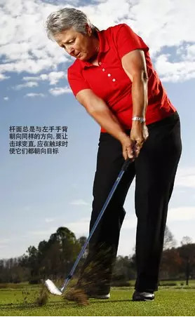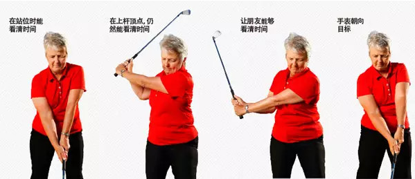 要变右曲球为直线球,关键在于忘掉你的右手,更多地注意左手。你的左手是控制手,左手与握柄的接触面积要大于右手。基本上,杆面朝向总是与左手手背保持一致。要在触球时确保两者都朝向正确的方向,可以戴上手表,模仿下面的动作。
