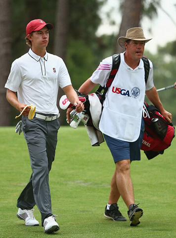 2014年美国公开赛,业余球员马弗里克-麦克尼利与为自己背包的爸爸