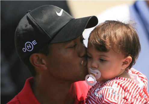 2008年,伍兹第三次赢得美国公开赛后,亲吻女儿