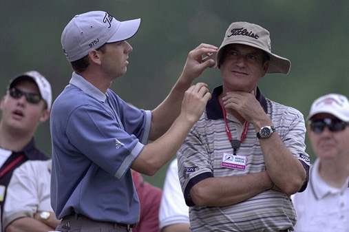 2001年,美国公开赛练习轮,加西亚查看父亲戴的渔夫帽