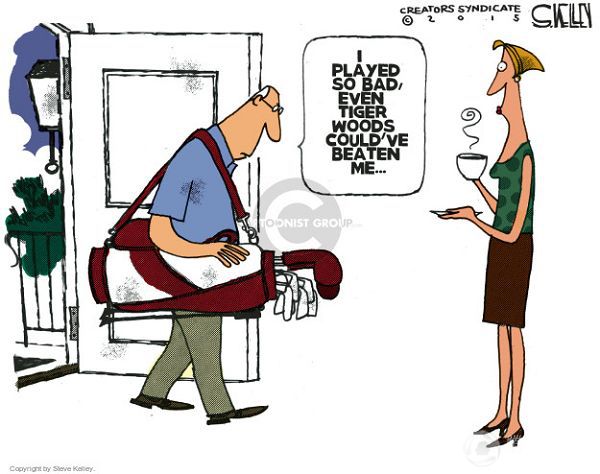 一位球友挎着球包,垂头丧气地进家门,这时,悠闲喝着咖啡的老婆问了一下他今天打球表现,男人叹气地说了一句:“打得特别不好,泰格-伍兹那样的都能打过我!”