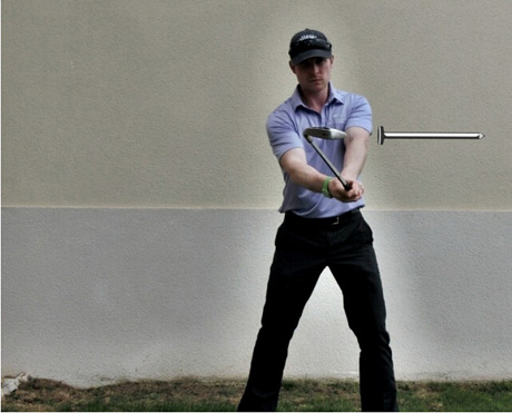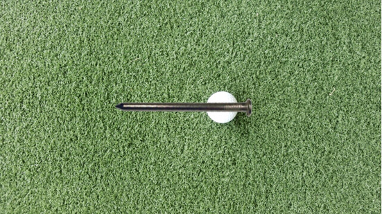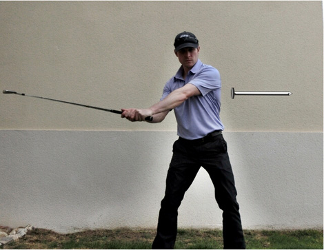 现在,将杆头降至地面高度。想象有颗钉子横穿高尔夫球(实际上有一粒带有钉子的高尔夫球,在训练时省去了视觉想象)。千万别让大脑中的理性思想指导你该如何挥杆,而是要凭着本能及直觉去击打想象中的钉子。