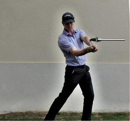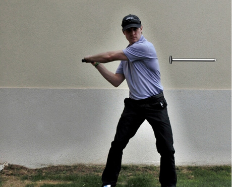 双手平伸握住球杆,球杆与地面平行,与胸齐高,像握住斧头一样挥舞。这时,想象在你前面有一颗巨大的钉子。在不做任何思考的情况下,进行后挥球杆,然后砸向这颗假想的钉子。重复做几组该动作,尽可能地用本能行为。