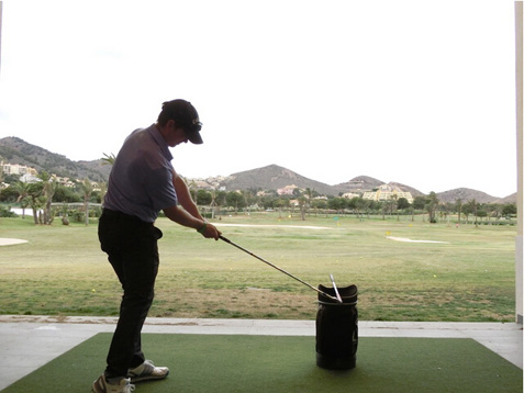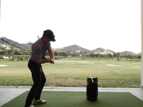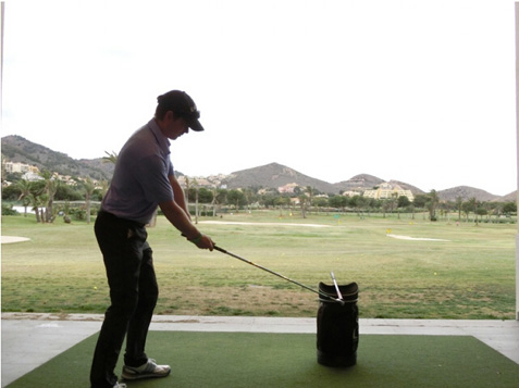如图所示,将杆头置于桶上方,重复之前的动作,将目标想象成钉子,后挥杆并将注意力集中于钉子上。杆头当然不要击中木桶,仅仅做出后挥杆及钉钉子的动作而已。