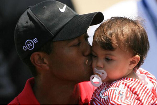 2008年伍兹在第三次赢得美国公开赛后亲吻女儿