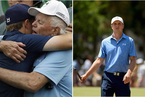 左图为斯皮思大师赛夺冠后与父亲相拥,右图为斯皮思在2014年美国公开赛上