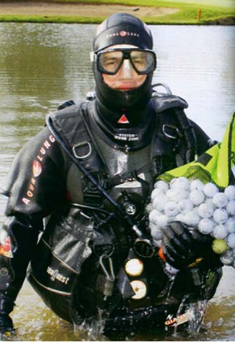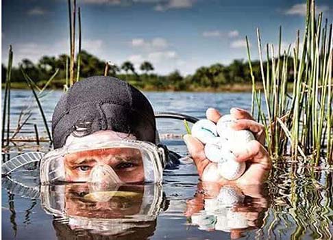 有些高级高尔夫球场,专业高尔夫球潜水员都能赚成百万富翁。一天基本上能够捞取3000个高尔夫球。工作的危险处就是水里有玻璃或者铁丝线,有的水潭里说不定还有鳄鱼爬行。