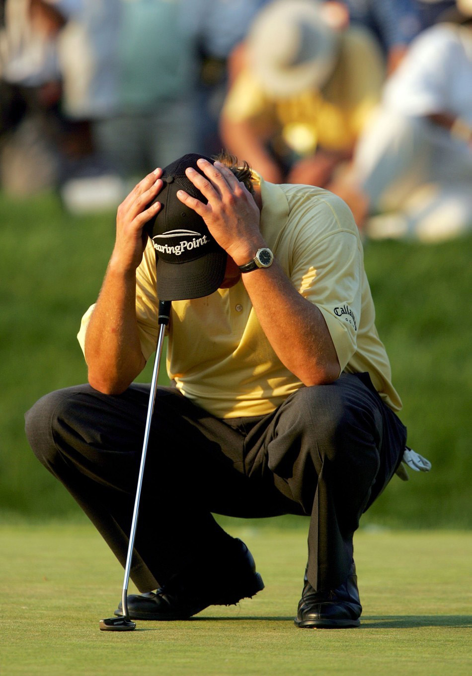 二、2006年美国公开赛,翼脚,菲尔-米克尔森一杆领先进入最后一洞,整轮都不怎么用一号木的他却抽出了driver,却遗憾slice打进了观众席,接下来救球本可以将球放上球道,却急于攻果岭导致再次slice,最终他吞下双伯忌被挡在加洞赛之外。老米随后留下那句名言:“我真是个白痴。”