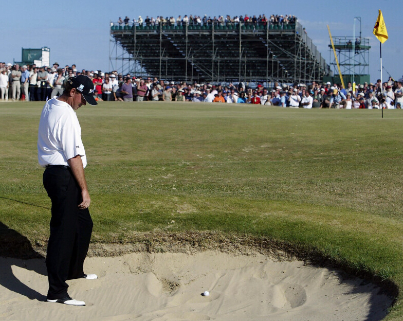 六、2003年英国公开赛,皇家圣乔治,丹麦人托马斯-比约恩来到第70洞的时候单独领先2杆。没有想到在那个第16洞三杆洞,他在果岭沙坑中,电视转播镜头中,足足刨了3杆才出来,最终以1杆之差输给大黑马本-柯蒂斯屈居亚军。