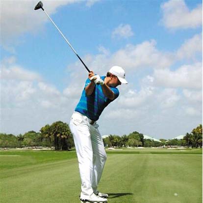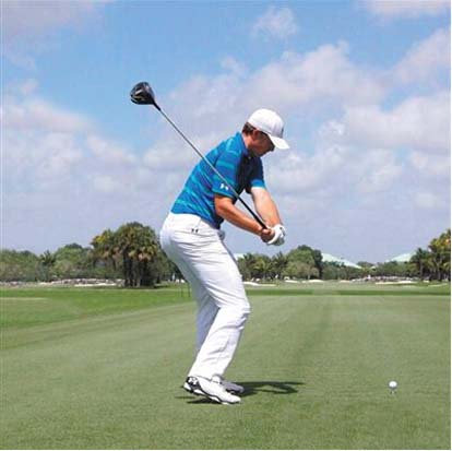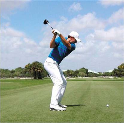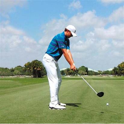 斯皮思的挥杆看上去有些特别,最显著的两个特点是上杆至顶点时没有完全伸直的左臂,以及下杆击球过程中左脚内侧的翻起。请具体看挥杆顺序图和解析,看看能从这位年轻的双满贯先生这里学到什么。