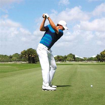3、上杆至顶点 从这个角度看,斯皮思的上杆顶点姿势非常好,左手背部平直,杆身指向目标。在上杆至顶点时,斯皮思的左臂并非完全绷直,这帮助他减少肌肉紧张感,并拥有更好的节奏。如果手臂过于绷紧反而会降低挥杆速度。