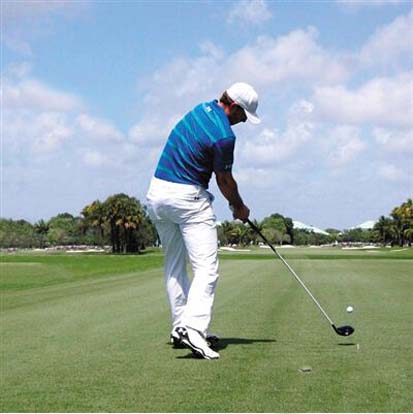 1、起杆 斯皮思的起杆动作是标准的一体式上杆。双肩与双臂之间组成的三角形一起移动,没有手腕动作。而有些业余球手在挥杆一开始就转动双腕,把球杆拉向身体内侧,这将给下杆时机的掌握增加难度。