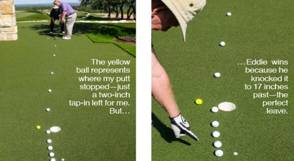 上图就是我和儿子Eddie玩“过洞17英寸”时的照片。左图中可见,我推了个20尺远的球,黄 色的球表示我的球最终停留的位置,距离洞口仅几英寸远。虽然不算太差,但我儿子的球却 绕过了球洞,停在了球洞前方位置,但他却赢了,为什么呢?即使我的球离洞口更近,但他 的推球速度比我的更好,因为适当的速度可以大大增加进洞的几率。