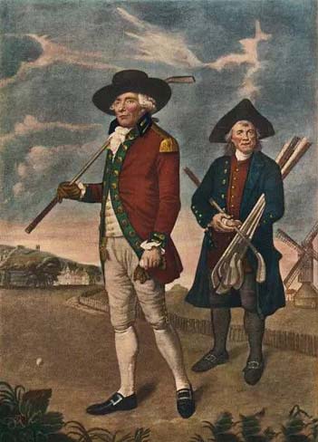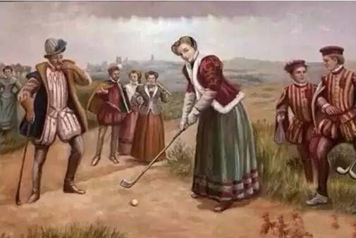 在16世纪,这位女王身着落地长裙,上身裹着厚重的外套,而这副白色长手套也是格外显眼。左边的男人穿紧身上衣、紧身裤,还有一件大外袍。这些厚重的衣服裹在身上,很难让挥动高尔夫球杆成为一件舒服的事情。