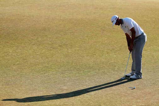 决赛轮,全场只剩达斯丁·约翰逊一位选手,他3英尺小鸟推不进,眼睁睁错失加洞机会