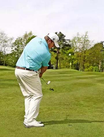距离果岭越近,双脚间距离就越小,向下握杆越多,这些都有助于减少击球距离。同时要注意保持身体姿势。劈杆击球时挥杆的基本要点与全挥杆基本要点同样重要。