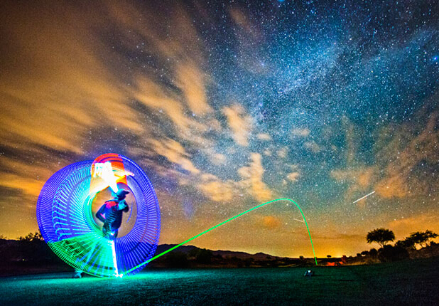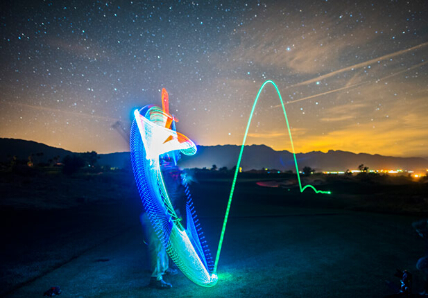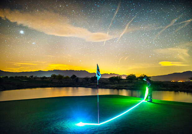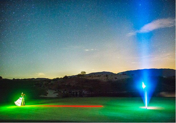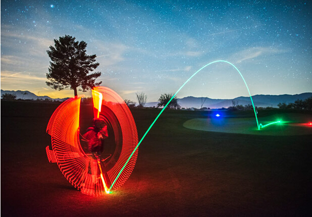 之所以挑选这个位于沙漠中心的球场是因为这里远离城市,远离人造光源,可以最大限度的 捕捉到来自银河的光。而他们要做的不仅仅是拍摄天空,还有应用了LED创意的高尔夫球 杆,这些球杆可以让摄影照片看起来奇幻无比!