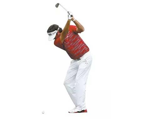 首先髋部向目标方向移动,紧接着伸直右腿增加转髋速度。他每次挥杆的髋部转动并不稳定,但很少有横移。