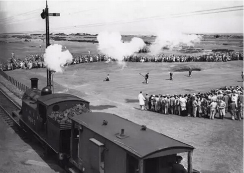 你知道圣安德鲁斯老球场旁曾经通过火车吗?图为1936年一辆火车在16号洞果岭旁等球员推球: