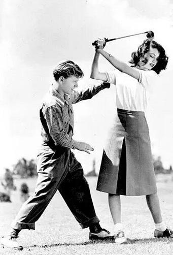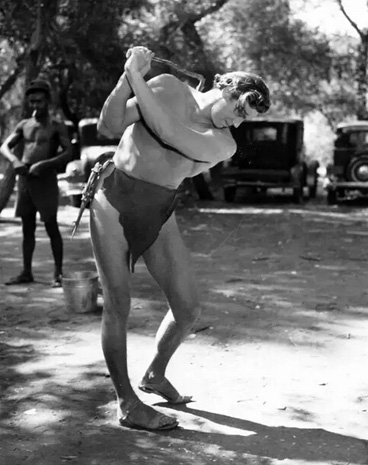 美国著名影星约翰尼-维斯穆勒在片场休息时挥杆: