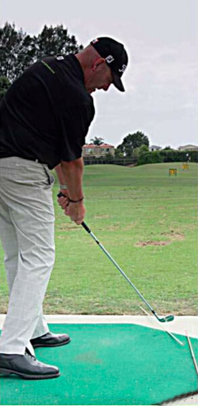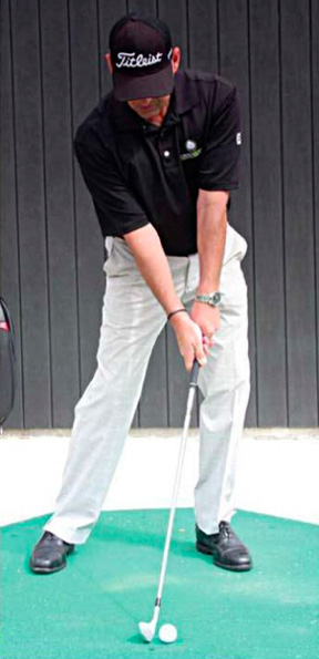 注意:让你的双手保持被动。为了做到这一点,不要让你的双手控制球杆。你的双手越被动,球飞的就越直。保持杆面与目标线垂直,握把末端指向你的胸骨。