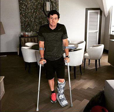现世界排名第一的麦克罗伊在个人社交媒体上发布了一张自己拄着双拐的照片,左脚穿着厚厚的保护靴。小麦称是在与朋友踢球时伤到了脚踝,目前看他很可能将缺席16日的英国公开赛。