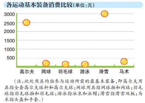 从图中不难看出,打高尔夫的装备开销确实要高于一般运动,网球、羽毛球和游泳的装备价格最低,可以在200元以内搞定;马术如果只计算头盔和手套(不含马匹本身),价格在300元左右,但是租马的话…那就另说了;而滑雪的装备虽然价格高于高尔夫装备,但大部分滑雪场提供免费的滑雪板和滑雪服的出租服务。