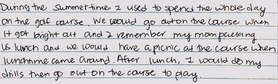“每个夏天,我经常整天整天地待在高尔夫球场上。一到天气晴朗的日子,我们就会去球场,我记得母亲会给我们准备午餐,中午我们就在球场上一起野餐。午餐结束,我就立刻投入到训练中,上球场打球。”