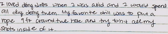 “我从小就喜欢训练,并且常常在球场上待一整天。我最喜欢的训练是将一根9英尺长的绳子围绕在球洞周围,再试图将所有球都击入圈内。”