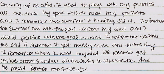 “成长过程中,我常常和父母打球。我的目标是击败他们,我记得有个夏天我终于做到了。那个夏天一开始,我便立下目标要打败我的父亲,训练的时候我时刻都在想着这个目标。我记得夏季快结束的时候,我非常接近完成目标,而且时至今天,我仍记得打败父亲的那个日子。随后我们还买了冰淇淋圣代来庆祝。自那以后他再也没赢过我。”