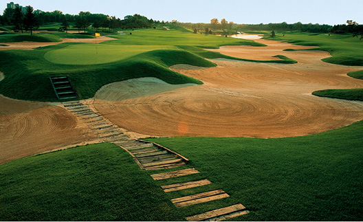 到了后九洞,水面依然是障碍区的主题之一,而沙坑更兼具难度和美学意义于一身,充分调动着球友们的兴趣。我们能够在叠泉乡村的设计上,看出帕尔默对于上个世纪20年代高尔夫球场设计黄金时期的迷恋和敬畏。那个时期的球场,不仅面积宽广、风景优美,而且场内各种设置都相当完备和复杂,设计师们也敢于设计出陡然变化的障碍,给人强烈的视觉冲击感,在打球时制造出出其不意的刺激。