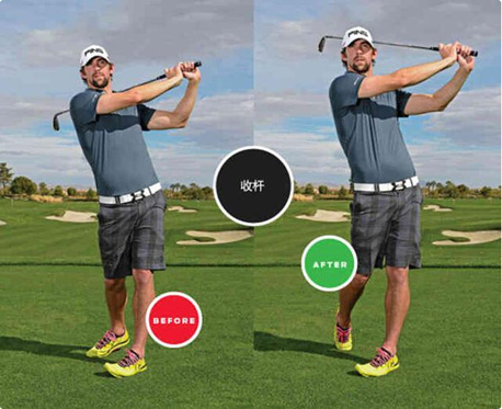 在调整挥杆之前,菲尔普斯启动下杆靠的是上半身主导,这样会导致挥杆过于陡直,路线由外而内,最常见的失误是右曲球。我对他的下杆进行了针对性调整,随后立马出现了左曲球,因为他放慢了下半身的转动速度,并没有跟随挥杆一起通过触球区。这样会导致双手在身前翻转,球往左转。合理的下杆是从地面开始的,由双脚开始向上到膝关节、髋关节,下半身一起转向目标方向,保持住收杆姿势,就像上右图那样。