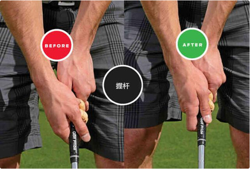 和许多业余球友一样,菲尔普斯会根据弹道问题,通过调整握杆方式来解决。菲尔普斯的常见问题是大右曲,因此他将右手握杆调得强势了一些(上左图),以求杆头更好地释放来解决右曲问题。但是在我的帮助下解决了挥杆路线和平面问题后,我又将他的握杆调回了方正姿势(上右图),与左手握杆相匹配。另外,我让他的右手食指调整为扣扳机姿势,食指与拇指间的距离近了点。这些调整帮助他更好地控制杆头,上杆更加紧凑。