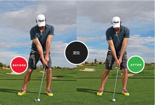 上左图是初学者在定位时最常见的问题,菲尔普斯也不例外。他习惯性将握把朝目标方向推,手臂向外伸出去,显得十分用力,杆面打开。以这样的姿势定位,根本不可能合理启动上杆,只能将球杆向后拉,导致挥杆平面过平,偏向内侧,随后将球杆绕回到顶点,下杆又变得过陡。通过调整杆身至正常的位置,保持手臂放松(上右图),就能够以合理的平面上至顶点处。