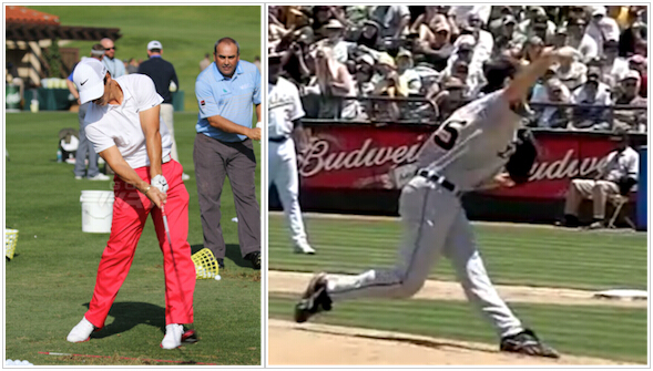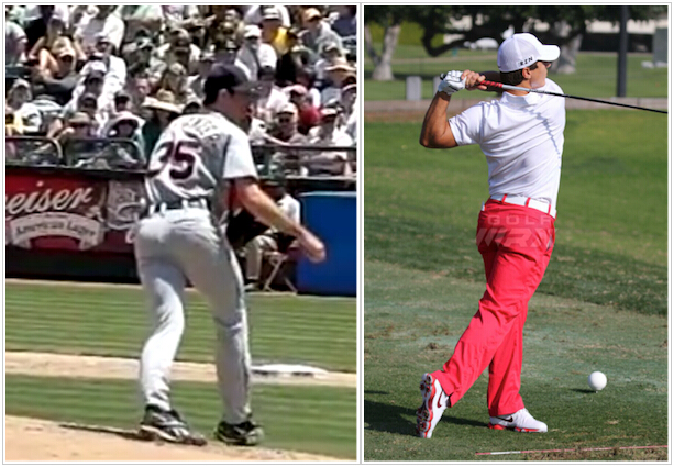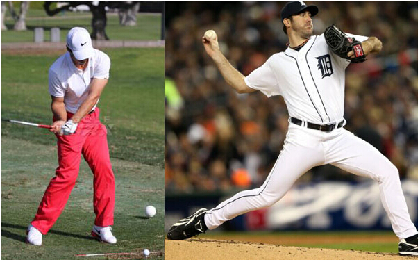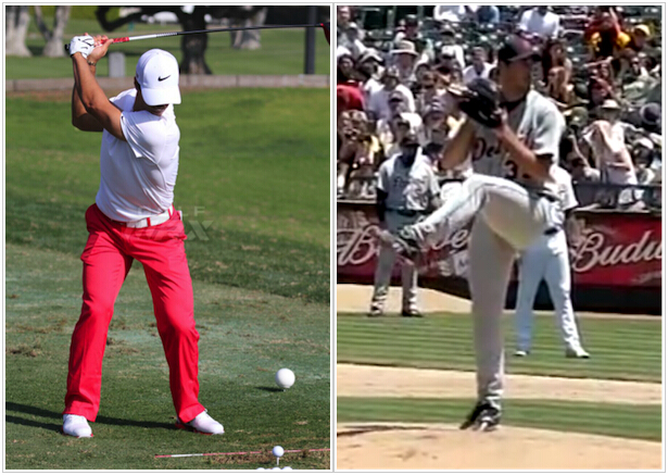 各位不妨看看下面两幅图片。左边这幅是Thorbjorn Olesen的挥杆图,而右边这幅则是Justin Verlander的投球图。我们可以发现,高尔夫与棒球在动作及姿势上有看多么大的相似性。接下来我们看看如何利用棒球的投球原理,来增强高尔夫挥杆力量及精准性。