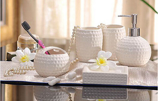 这款套装组合包括一个乳液瓶(9*9*14.5cm)、一个牙刷架(9.5*9.5*7.5cm,可放牙膏和两支牙刷)、两个牙刷杯(7.5*7.5*9.5cm/个)以及一个肥皂碟(12.5*8*2.5cm)。