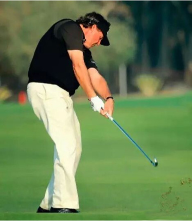 如果想学习米克尔森的动作,那你上杆时尽可能上到让你舒服的最大幅度。转动你的躯干和臀部,这是帮你增加挥杆力量最直接的方法,并且你可能没有职业选手那样的身体柔韧性做到让上半身充分转动。然而,学习米克尔森在下杆过程中积极的释放非常重要,这样击球之后杆头向目标线的左边运动,而不是一直维持在目标线上。