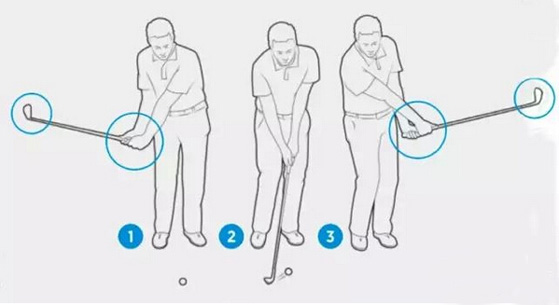 双脚并拢,并用七号铁做半挥杆练习。立腕并转动小臂,让杆头趾部指向上方,左手手背指向外面。