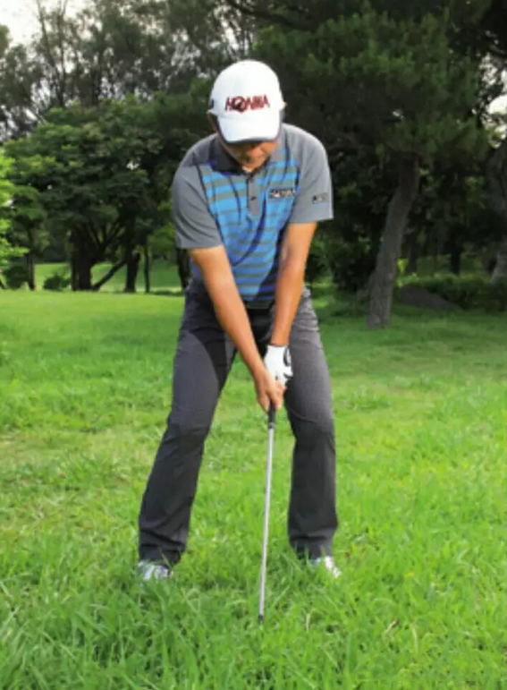 瞄球时大幅打开杆面,增加球起飞的角度。站姿比正常略宽,且膝盖弯曲幅度加大,感觉有点往下坐,重心放在脚掌中央。球置于脚位中央偏前,感觉杆面整个打开平躺在地面上。