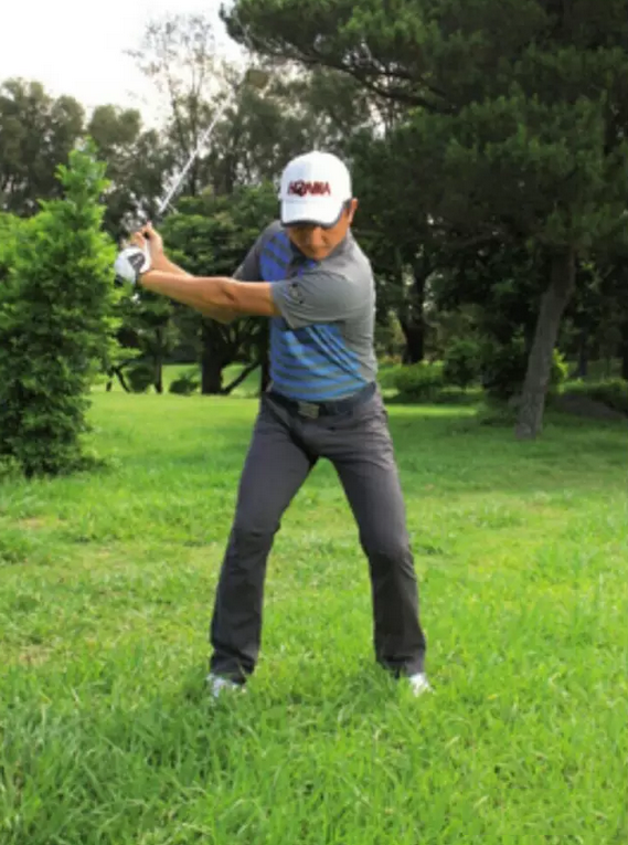 曲腕上杆的同时转动肩膀,进入上杆顶点。很多球友把曲腕误解为翻转手腕,而在上杆时将杆头拉到身后,这是错误的。正确的曲腕是手腕朝大拇指方向曲起,如此才能创造更为陡直的上杆平面,从这样的上杆顶点下杆,即使全力释放,杆面依旧能保持开放通过触球。