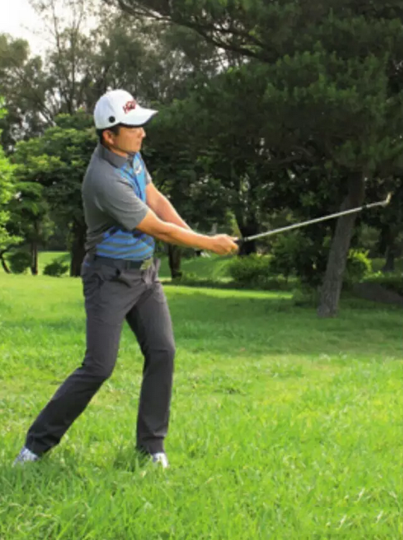 下杆时释放双手,同时持续转身通过触球。你的速度越快,球就会飞得越高、后旋越强。要将球从粗草里高抛出来,关键在于从头到尾都要维持杆面开放。当我通过触球进入送杆后,杆面依旧朝向天空,代表杆面仍是打开的。
