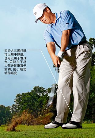 我将要推荐的这种简单的击球类型也是许多巡回赛球员在比赛压力下的选择。有些教练称其为控制击球,我则喜欢称其为稍低于标准弹道的四分之三挥杆。掌握了这种打法以后,你可以在球场上任何地方使用它,包括发球台。因为它会比标准击球飞得更直,更可靠,更容易预判结果。此外,四分之三挥杆的技术还能让你体会到稳固的铁杆挥杆所需的基本技术的感觉,帮助你在找不到铁杆击球感觉时重整旗鼓。