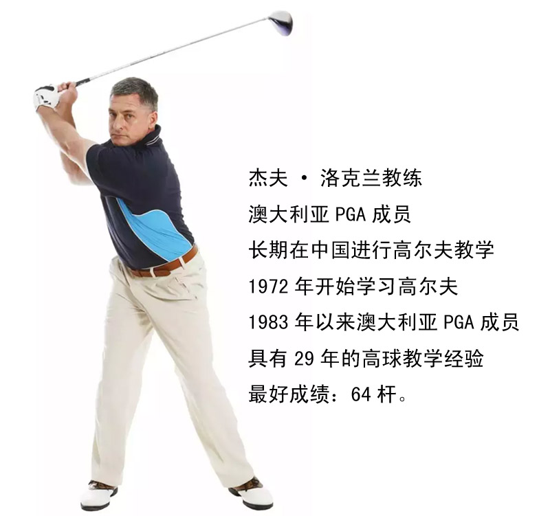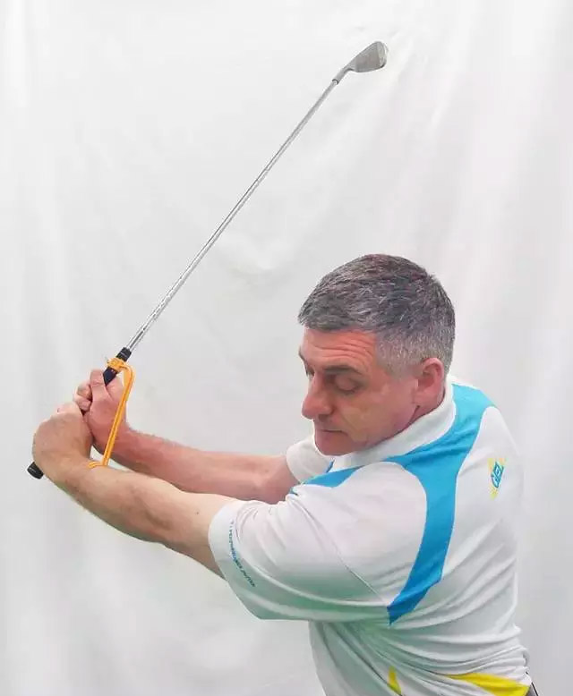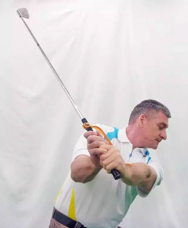 • 开始挥杆时速度要慢,这样头可以转过去对动作进行观察。当球杆挥至齐腰的位置,与地面平行时,左手腕逐渐上翻直至高尔夫挥杆角度固定器接触到左前臂,完成上挥杆。