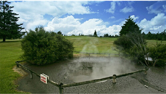 罗托鲁瓦高尔夫俱乐部除了常规的18洞球场,还有一个9洞温泉球场。这个高尔夫球场里温泉在冒着泡、间歇泉涌动、硫磺的味道弥漫在空气中。俱乐部旁边就是华卡雷瓦地热保护区。