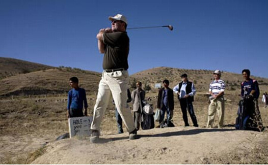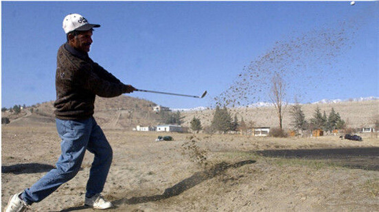 没有比这更正式的球场了。333军事警察(宪兵)部队的士兵,在位于阿富汗与巴基斯坦边界的帕克蒂卡省的基地里挥舞球杆。