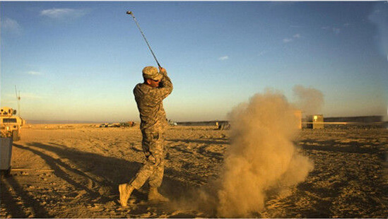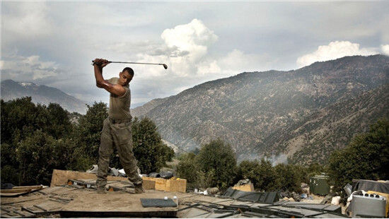 在英裔美国摄影师蒂姆·赫瑟林顿2010年逝世之前,他为驻守在阿富汗东北部前哨的士兵们拍了照片。现在,他的作品正在他的家乡英国利物浦的大开眼界 美术馆里展示。他的作品探索士兵们如何抚平创伤、排遣情绪,而其中一幅作品便是图中专家斯特林·琼斯正在克拉高山谷的火力支援基地屋顶上练习高尔夫。
