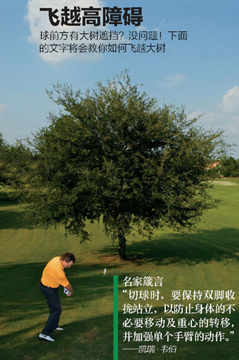 你可以选择打安全球,利用特殊铁杆半挥杆先把球打回球道上,但你此时急于降低杆数,以求在本轮比赛中获得更好的名次或打到原定的目标杆数。通过对你的站位和挥杆做一些小调整,你就能够加大有效杆面倾角,使球飞越大树,在果岭上着陆。