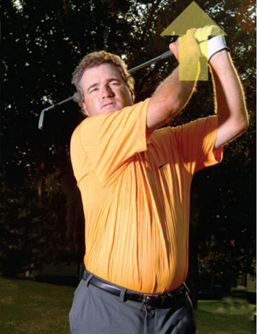 步骤二:打出高飞球的秘诀就是挥杆陡,做出更垂直的下杆, 向下击打,使球迅速上升,达到更高的飞行高度。为了制造出更陡的挥杆轨迹,上杆时手腕迅速上翘。